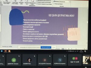 11 червня 2021 року студенти 1 курсу спеціальності 012 Дошкільна освіта вперше звітували про результати навчальної пропедевтичної практики в закладах дошкільної освіти, яка тривала упродовж 6-ти тижнів – з 3 травня по 11 червня. У зв’язку з епідеміологічною ситуацією в країні, базами практик стали дитячі садки за місцем проживання здобувачів вищої освіти. Керівництво практикою, в дистанційному режимі здійснювала к.п.н., старший викладач кафедри Ватаманюк Г.П.