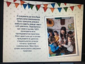 … згадала рідний садок, себе в ньому, виховательку й усвідомила, що педагог, відданий своїй справі завжди був, є і буде авторитетом в очах дитини. Вважаю, що практика на 1 курсі – важливий етап у професійному розвитку, саме час зрозуміти, чи твій це шлях»
