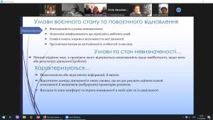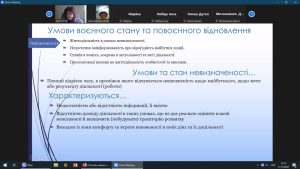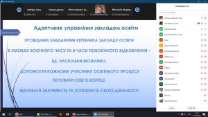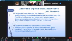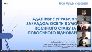 11 жовтня 2022 року науково-педагогічні працівники кафедри теорії та методик дошкільної освіти відвідали гостьову лекцію з теми: «Адаптивне управління закладом освіти в умовах воєнного стану та повоєнного відновлення» доктора педагогічних наук, професора, завідувача кафедри менеджменту освіти і права Державного закладу вищої освіти «Університет менеджменту освіти» НАПН України (м. Київ) Зої Рябової. Зустріч відбувалась за допомогою сервісу Zoom.