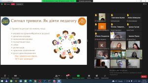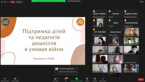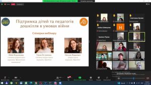 Так, 22 лютого 2023 року науково-педагогічні працівники кафедри теорії та методик дошкільної освіти та здобувачі вищої освіти спеціальності «Дошкільна освіта» взяли участь у online-вебінарі «Підтримка дітей і педагогів дошкілля в умовах війни». Спікерами заходу виступили Юлія Журлакова – головна редакторка науково-методичного журналу «Дошкільне виховання», Ганна Остапенко – головна редакторка журналу «Джміль» та Наталя Людкевич – редакторка журналу «Джміль».