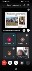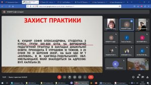 10 квітня 2023 року на платформі Google Meet відбулася звітна конференція за результатами проходження виробничої педагогічної практики здобувачами вищої освіти 3 курсу DO1-B20 групи. Тривала практика упродовж 10-ти тижнів у закладах дошкільної освіти Кам’янець-Подільської міської ради м. Кам’янця-Подільського. Керівник практики зі спеціальності Ватаманюк Г.П. привітала здобувачів освіти з успішним завершенням практики, ознайомила зі складом комісії по захисту, до якої ввійшли викладачі – керівники практики з фаху Галаманжук Л.Л. – д.п.н., професор, завідувач кафедри, Пукас І.Л. – к.п.н., ст. викл. Гордійчук М. С. – к.п.н., доцент, Каньоса Н.Г – к.п.н., доцент, Демчик К.І. к.п.н., ст. викл кафедри. Також Галина Петрівна запропонувала регламент і порядок виступів-захистів.