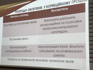 Спікер-майстер заходу – Оксана ТКАЧ, у теоретичній частині висвітлила природничі і психологічні засади мовленнєвих та моторних процесів, алгоритм їх формування в дітей дошкільного віку, звернула увагу на розподіл обов’язків вчителя-логопеда і вихователя у корекційній роботі з дітьми. У практичній частині педагоги і здобувачі освіти ознайомилися із комплексом артикуляційних вправ, засобами і прийомами корекційної роботи перед дзеркалом і без нього, методикою їх використання. Далі створені фокус-групи з педагогів і здобувачів освіти третього курсу працювали над складанням плану корекційної роботи з вихованцями упродовж одного тижня. Захист створених планів засвідчив позитивні результати засвоєння презентованого науковцем і майстром матеріалу.