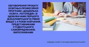 4 січня 2024 року в дистанційному форматі відбулося обговорення проєкту освітньо-професійної програми «Дошкільна освіта. Логопедія» з здобувачами першого (бакалаврського) рівня вищої, 1-4 років навчання, представниками студентського самоврядування, випускниками.