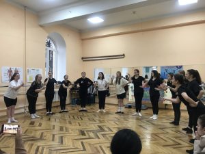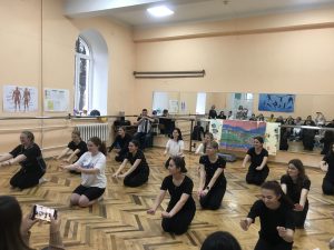 Кульмінацією творчого запалу під час семінару стали музично-рухова і хореографічна робота здобувачів освіти із досвідченим майстром танцю, керівником художнього колективу Зразкового ансамблю народного танцю «Горличка» Кам’янець-Подільського Центру дитячої та юнацької творчості Бурейко Г.І., яка відкрила майбутнім вихователям чимало таємниць танцювального мистецтва, які стосуються дітей дошкільного віку. Арт-майстерня працювала в посиленому емоційно-насиченому режимі творчості. Дівчата збагнули не тільки красу і значущість руху під музику, специфіку танцювальних жанрів у дошкільному віці (народні танки, колові, сюжетні, комунікативні, святкові флешмоби тощо), принципи добору музичного супроводу до танцю, танцювальної атрибутики, костюмів та їх елементів, ази рухової творчості, а й стали безпосередніми учасниками таких танцювальних композицій регіонального характеру як «Варенички», «Кривий танець», «Сонечко», «Подільський віночок».