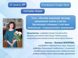 Гостьова лекція “Основи взаємодії закладу дошкільної освіти з сім’єю. Організація співпраці з сім’ями вихованців з порушеннями мовлення” Тетяна МАРЄЄВА