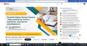 14 серпня 2024 року науково-педагогічні працівники кафедри долучились до онлайн-зустрічі «Вивчаємо новий Закон України «Про дошкільну освіту»», яка транслювалась за допомогою популярного відеохостингу Youtube.