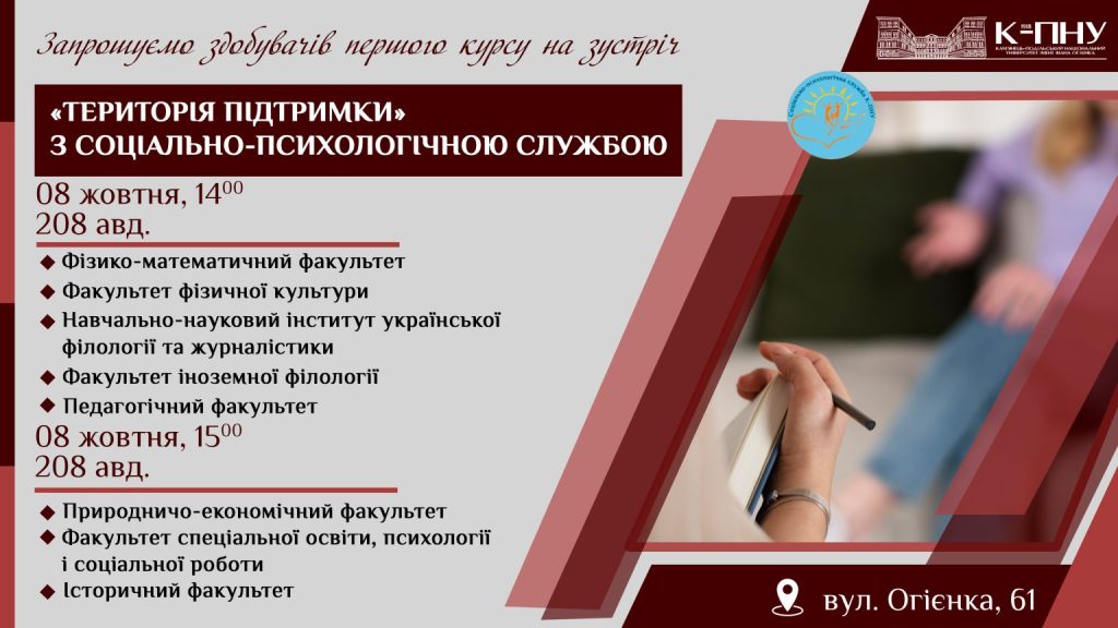 8 жовтня соціально-психологічна служба К-ПНУ запрошує здобувачів першого курсу педагогічного факультету на зустріч «Територія підтримки» о 14:00