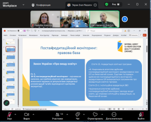 Під час семінару учасники обговорили інструменти аналізу ефективності освітніх програм, способи документування змін, роль внутрішньої системи забезпечення якості освіти, а також практичні аспекти підготовки матеріалів для моніторингових процедур.