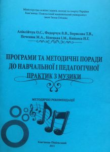 Програми та методичні поради до навчальної і педагогічної прктик з музики / [О.С.Аліксійчук, В.В.Федорчук, Т.В.Борисова, М.А.Печенюк, І.М.Білецька, Каньоса Н.Г.]. Кам’янець-Подільський : Зволейко Д. Г., 2011. 68 с. У методичних рекомендаціях представлена структура навчальної та педагогічної практик для студентів спеціальності “Музика”. Подано цілі, завдання, зміст кожної практики, зразки оформлення матеріалів практики, вимои до студентів-практикантів. Методичні рекомендації пропонуються студентам, викладачам педагогічних факультетів вищих навчальних закладів, а також учителяммузики загальноосвітніх навчальних закладів. |