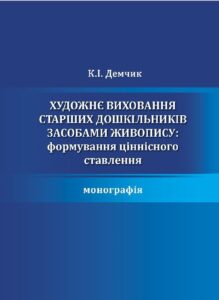 Демчик К. І. Художнє виховання старших дошкільників засобами живопису : формування ціннісного ставлення : монографія. Кам’янець-Подільський : Друк-сервіс, 2017. 170 с. У монографії здійснено науковий аналіз проблеми формування ціннісного ставлення до живопису в старших дошкільного віку та визначено сутність поняття «ціннісне ставлення дитини до живопису». Розкрито й обґрунтовано особливості сприймання і розуміння живопису старшими дошкільниками на основі досліджень у галузі дошкільної педагогіки. Виявлено реальний стан науково-методичного забезпечення процесу формування ціннісного ставлення до живопису у практиці дошкільного виховання. Обґрунтовано та визначено критерії та їхні показники, встановлено рівні сформованості ціннісного ставлення до живопису в старших дошкільників. Розроблено авторські методики, спрямовані на формування ціннісного ставлення до живопису в старших дошкільників. Подані методичні рекомендації з художнього виховання старших дошкільників засобами живопису. Для науковців, педагогів вузів та дошкільних навчальних закладів, студентів, аспірантів, а також для усіх, хто цікавиться проблемами естетичного виховання дошкільників засобами образотворчого мистецтва та живопису зокрема. |