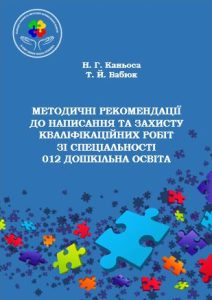Методичні рекомендації до написання та захисту кваліфікаційних робіт зі спеціальності 012 Дошкільна освіта : навчально-методичний посібник [Електронний ресурс] / уклад. Н.Г. Каньоса, Т.Й. Бабюк. Кам’янець-Подільський : Видавець Ковальчук О.В., 2023. 146 с. URI: http://elar.kpnu.edu.ua/xmlui/handle/123456789/7495 У методичних рекомендаціях визначено загальні вимоги до змісту, структури й оформлення кваліфікаційних робіт здобувачів вищої освіти другого (магістерського) рівня вищої освіти спеціальності 012 Дошкільна освіта у Кам’янець-Подільському національному університеті імені Івана Огієнка. Для здобувачів і викладачів закладів вищої освіти. |