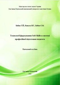 Технології формування Soft Skills в системі професійної підготовки педагога : навчальний посібник [Електронний ресурс] / уклад. Т.Й.Бабюк, Н.Г.Каньоса, С.М.Бабюк. Кам’янець-Подільський : Видавець Ковальчук О.В., 2023. 222 с. URI: http://elar.kpnu.edu.ua/xmlui/handle/123456789/7499 У навчальному посібнику розглядаються основні питання розвитку у здобувачів вищої освіти педагогічних спеціальностей соціально-особистісних компетентностей («soft skills»), корисних для становлення у професійній та особистій сферах життя. Викладено навчальні матеріали з основних компетентностей, наведено факти й аргументи, щоб стимулювати молодь до саморозвитку. Посібник буде корисним для здобувачів освіти усіх педагогічних спеціальностей, усіх форм здобуття освіти, управлінцям, працівникам кадрових агентств та менеджерам з персоналу, а також для усіх, хто прагне успішно будувати власну кар’єру та особисте життя. |