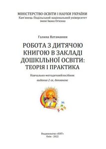 Ватаманюк Г. П. Робота з дитячою книгою в закладі дошкільної освіти: теорія і практика: навчально-методичний посібник. Видання 2-ге, доповнене. Київ: КНТ, 2022. 488 с. URI: http://elar.kpnu.edu.ua:8081/xmlui/handle/123456789/6854 У посібнику висвітлено теоретичні та організаційно-методичні аспекти роботи з дитячою книгою в закладі дошкільної освіти. Розкрито роль дитячої книги у формуванні особистості дошкільника, описано типологію дитячих книг та їх елементи; виявлено й обґрунтовано психологопедагогічні умови та методико-технологічний інструментарій роботи з дитячою книгою, описано методику роботи з літературними жанрами на різних етапах дошкільного дитинства. Подано схему аналізу дитячої книги, контрольні і практичні завдання, дидактичні та довідкові матеріали, конспекти окремих форм роботи з дітьми, батьками, вихователями в закладі дошкільної освіти, методичні рекомендації̈для батьків. |