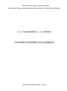 Галаманжук Л. Л., Єдинак Г. А. Основи наукових досліджень: навчально-методичний посібник. Кам янець-Подільський: ТОВ “Друкарня “Рута”, 2019. 154 с. URI: http://elar.kpnu.edu.ua:8081/xmlui/handle/123456789/6956 У посібнику викладено логіку наукового дослідження, його методологічні основи, методи. Адресовано студентам, магістрантам педагогічних факультетів закладів вищої освіти різних рівнів акредитації й аспірантам. |