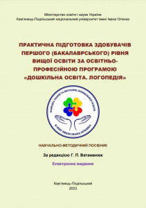 Практична підготовка здобувачів першого (бакалаврського) рівня вищої освіти за освітньо-професійною програмою «Дошкільна освіта. Логопедія»: навчально-методичний посібник [Електронний ресурс] / укладачі: Г.П. Ватаманюк, Л.Л. Галаманжук; за редакцією Г. П. Ватаманюк. Кам’янець-Подільський: Кам’янець-Подільський національний університет імені Івана Огієнка, 2023. 170 с. URI: http://elar.kpnu.edu.ua/xmlui/handle/123456789/7557 Посібник присвячено проблемі практичної підготовки майбутніх вихователів дітей дошкільного віку і логопедів. В основі посібника лежить наскрізна програма практики здобувачів першого (бакалаврського) рівня вищої освіти галузі знань 01 Освіта / Педагогіка, спеціальності 012 дошкільна освіта за освітньо-професійною програмою «Дошкільна освіта. Логопедія». У програмі схарактеризовано теоретико-методичні засади практичної підготовки; описано види педагогічних практик, які здобувачі освіти проходять під час навчання та їх зміст (завдання, етапи виконання тощо); подано інструктивно-методичні матеріали з ведення й оформлення звітної документації з практики та самоорганізації під час її проходження. Посібник адресовано фахівцям у галузі дошкільної освіти – науково-педагогічним працівникам, роботодавцям, вихователям-наставникам, здобувачам освіти денної і заочної форми навчання. |