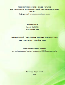 Етнопедагогіка дитинства: навчально-методичний посібник / авт.-упор. М.С. Гордійчук, І. Л. Пукас, Кам’янець-Подільський: Видавець Ковальчук О.В., 2023. 168 с. Матеріали навчально-методичного посібника вміщують теми та плани практичних занять, загальні методичні рекомендації до них, завдання для самостійної роботи, список використаних джерел та глосарій термінів. Також є тестові завдання для самоконтролю. Навчально-методичне видання допоможе майбутнім вихователям закладів дошкільної освіти глибше освоїти основні теми дисципліни «Етнопедагогіка дитинства», підготуватись до практичних занять, опрацювати рекомендовану літературу, зорганізувати самостійну роботу. Наведені матеріали допоможуть майбутнім вихователям ЗДО організовувати роботу дошкільників під час проходження педагогічної практики. Навчально-методичний посібник адресовано здобувачам вищої освіти зі спеціальності 012 Дошкільна освіта, педагогам закладів дошкільної освіти, викладачам закладів вищої освіти педагогічних спеціальностей. |