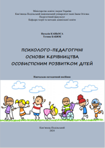 Психолого-педагогічні основи керівництва особистісним розвитком дітей: навчально-методичний посібник [Електронний ресурс] / Укладачі: Н.Г.Каньоса, Т.Й.Бабюк. Кам’янець-Подільський : Видавець Ковальчук О.В., 2024. 198 с. URI: http://elar.kpnu.edu.ua/xmlui/handle/123456789/8213 Навчально-методичний посібник укладено відповідно до робочої програми навчальної дисципліни «Психолого-педагогічні основи керівництва особистісним розвитком дітей» для підготовки фахівців другого (магістерського) рівня вищої освіти галузі знань 01 Освіта/Педагогіка спеціальності 012 Дошкільна освіта. У посібнику вміщено програму навчальної дисципліни, теми лекційних та практичних занять, методичні рекомендації до самостійної та індивідуальної роботи, глосарій, список рекомендованої літератури та додатки. Посібник буде корисним для здобувачів вищої освіти, які навчаються за спеціальністю 012 Дошкільна освіта, викладачам закладів вищої освіти, які готують фахівців з дошкільної освіти, керівникам, вихователям-методистам, вихователям закладів дошкільної освіти. |