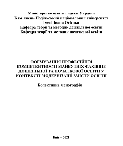 Формування професійної компетентності майбутніх фахівців дошкільної та початкової освіти у контексті модернізації змісту освіти : колективна монографія / за ред.: Н. В. Бахмат, Н. В. Гудими. Київ : Міленіум, 2021. 324 с. |